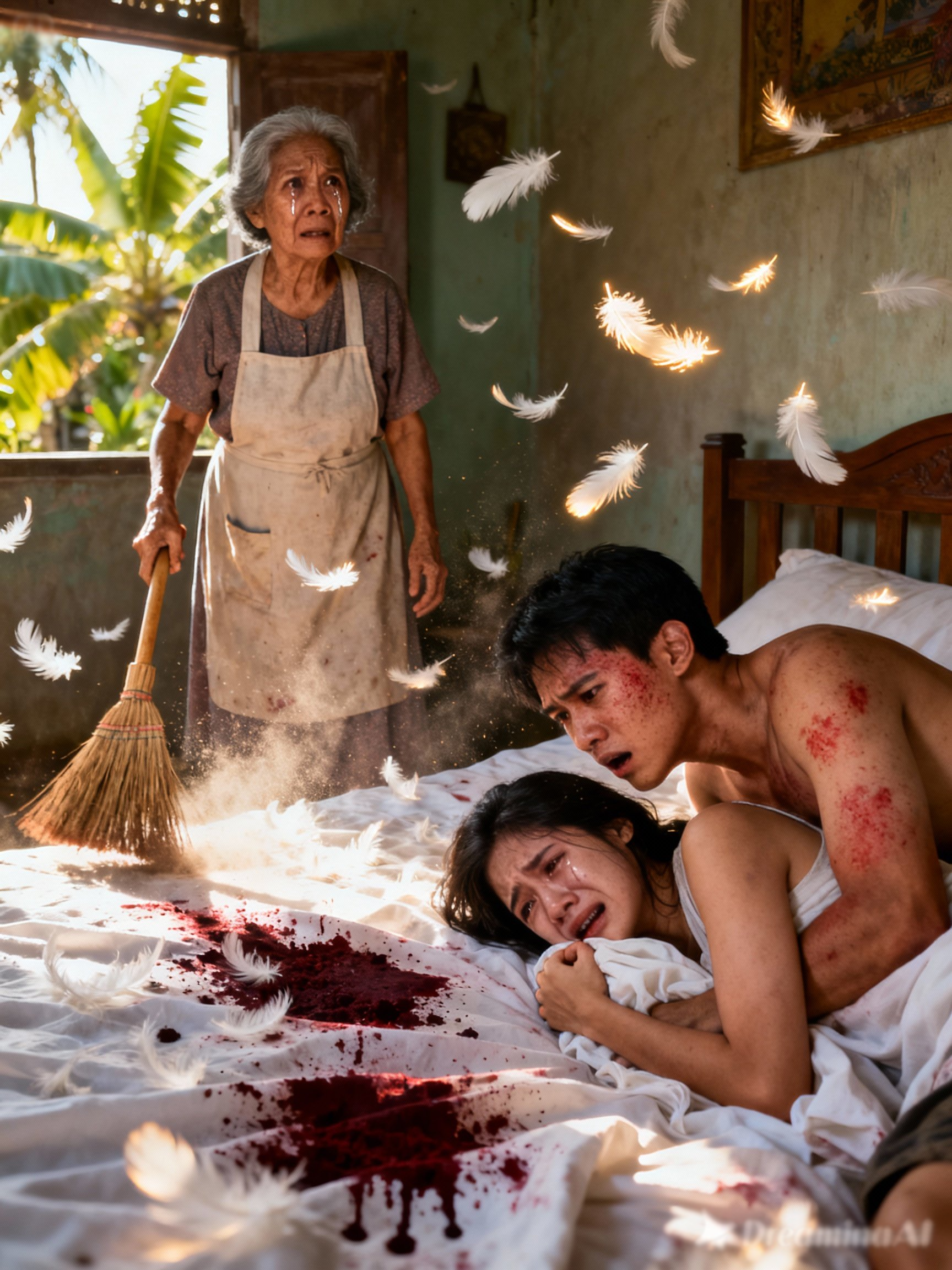 The white cotton sheets—her most expensive wedding gift—were covered in dark, deep red stains, thick and smeared, like dried blood. White feathers were scattered everywhere, stuck to the damp patches, floating like snow over a battlefield.