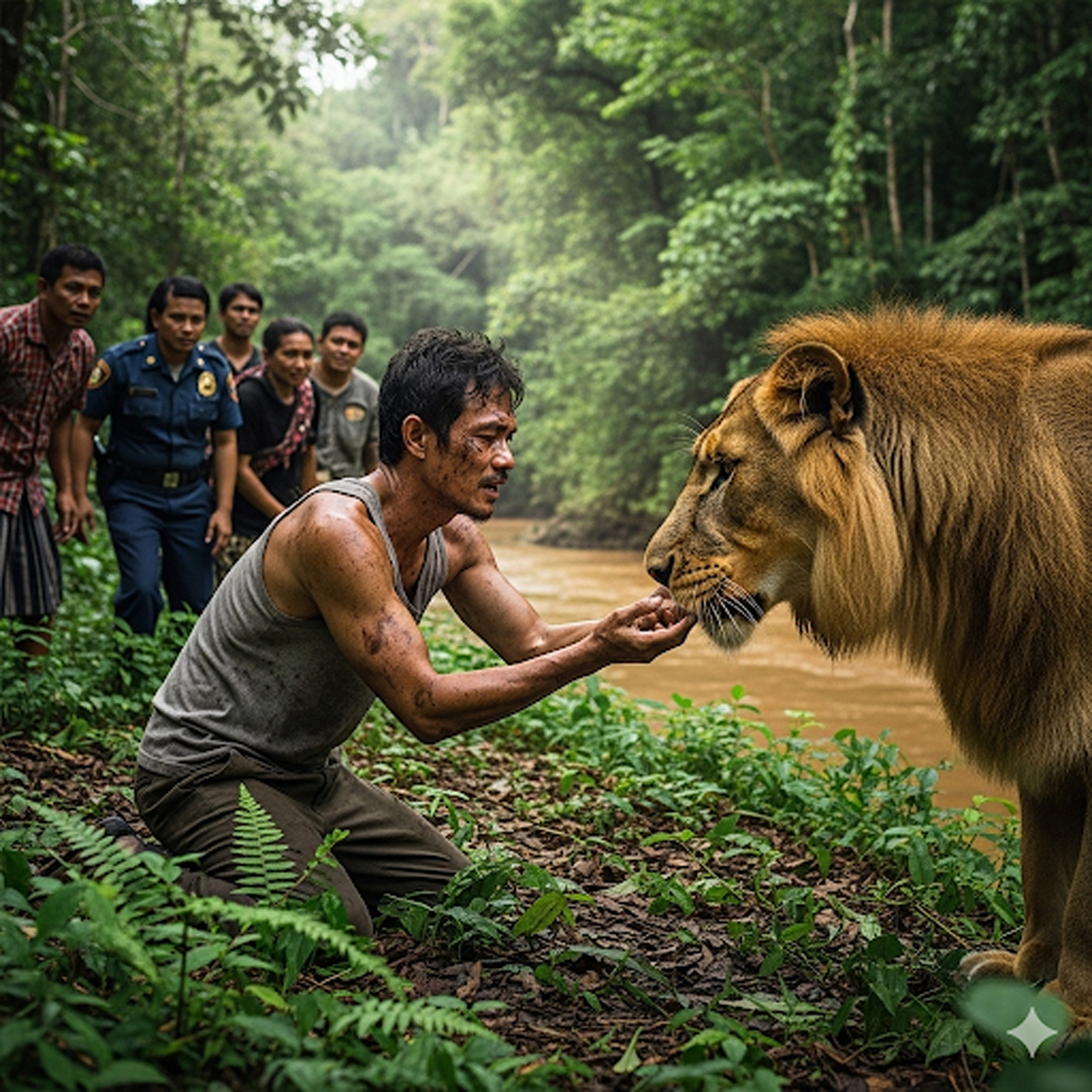 The lion stopped, walked slowly towards Ramon. Every step was heavy, every move was like a test of his courage. Until he reached him, and instead of grabbing him… the lion lowered its head and pressed it against his shoulder, as if embracing and thanking him.