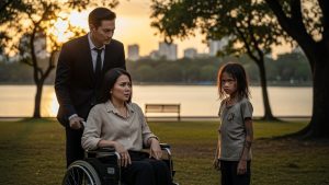 The sun rested gently over the lake at Rizal Park, its light dancing on the water as if the world were celebrating something without her. Miguel Santos pushed her wheelchair with the perfect, careful touch of a man who wanted everyone to see how devoted he was. He smiled at passersby, nodded politely, and from time to time leaned down to ask, with rehearsed tenderness: