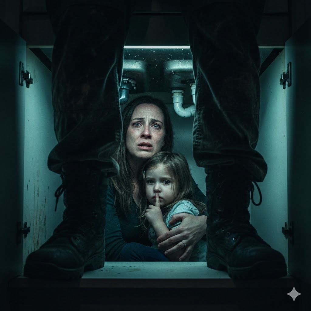 Emily pulled me toward the kitchen. Without thinking, I followed. We squeezed into the cupboard beneath the sink, knees pressed against cleaning supplies, the smell of detergent sharp in my nose. I held my breath as footsteps moved across the living room floor.