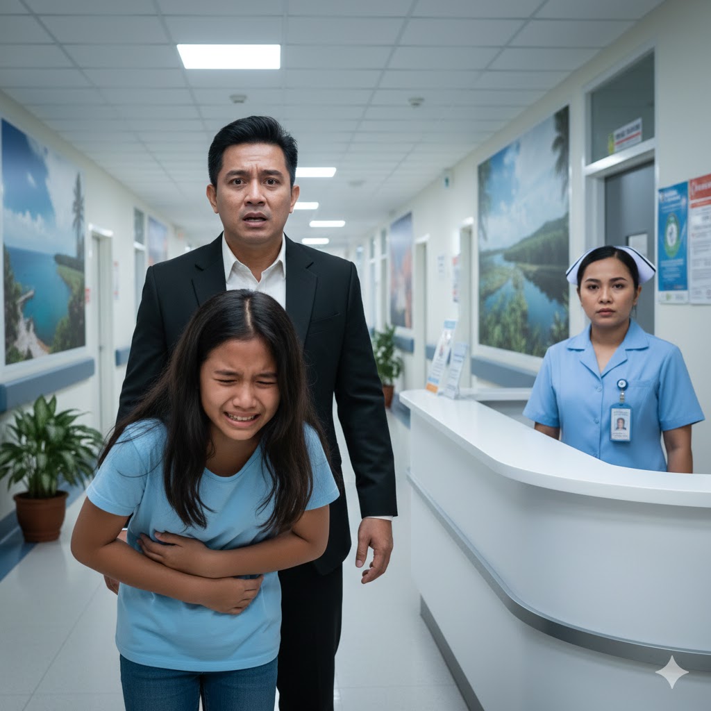 Her stomach burned from the inside. This was no ordinary pain; it was like a claw tightening around her belly with every step, forcing her to bend forward and hug herself as if she could keep her organs in place. Her lips trembled, yet she gathered what little strength she had and walked toward the reception desk.