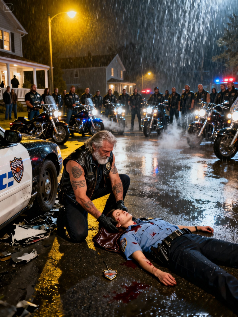 Hell’s Angel discovers injured female cop on street 50 bikers immediately show up. The Harley’s steady rumble cut through the evening quiet of Main Street. The lone biker straightened his machine, squinting through his rainspeckled visor as he spotted the metallic glint of a fallen police badge near the curb. His boots hit the pavement with a splash.