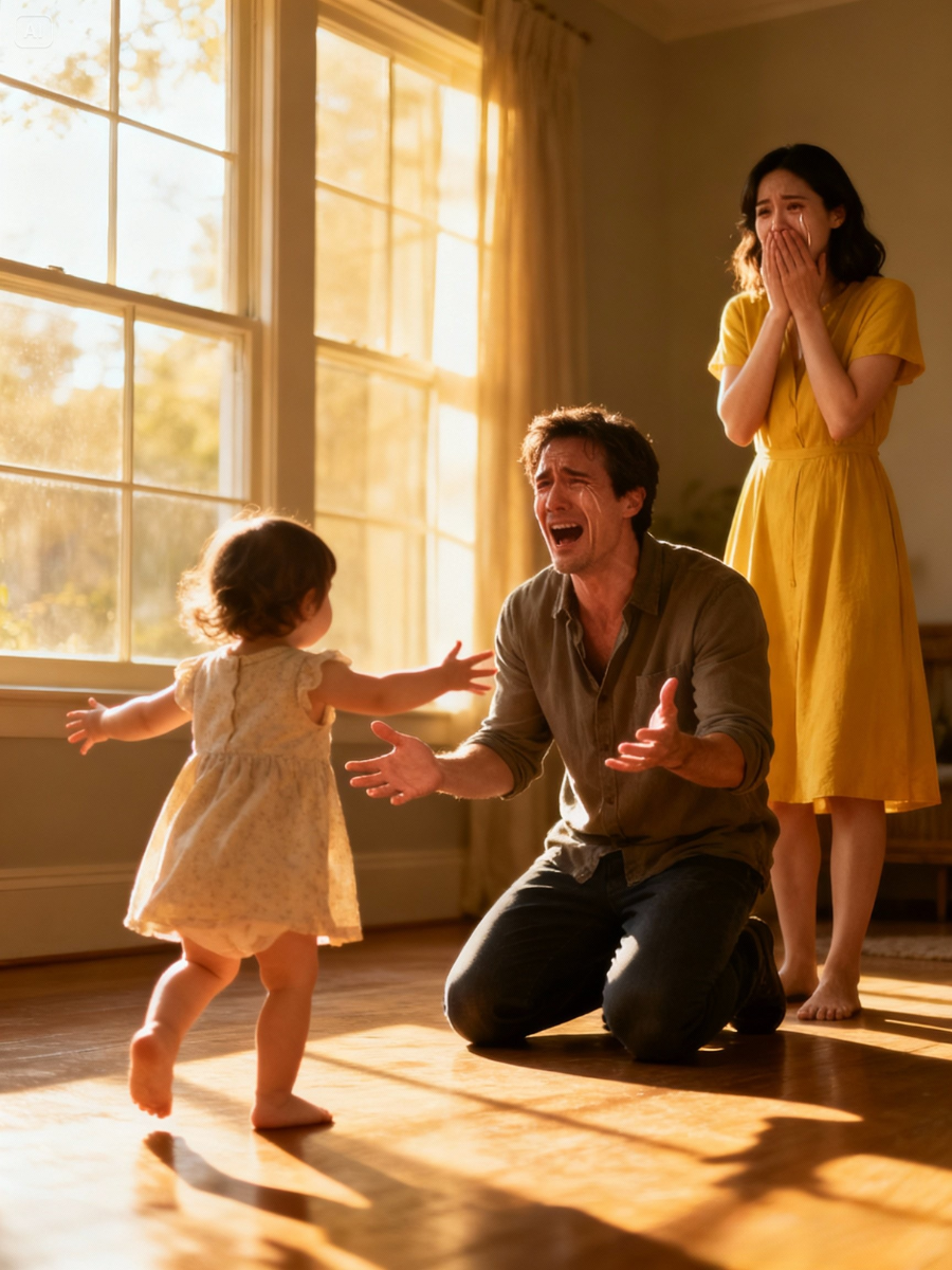 Alice tried once. She fell. She tried again. She trembled. On the third try, she stood up, leaning on the sofa. The adults looked like statues. And then she took a step. Awkward, uncertain… but real. Then another. She let go of the sofa and for three magical seconds stood alone in the middle of the room.