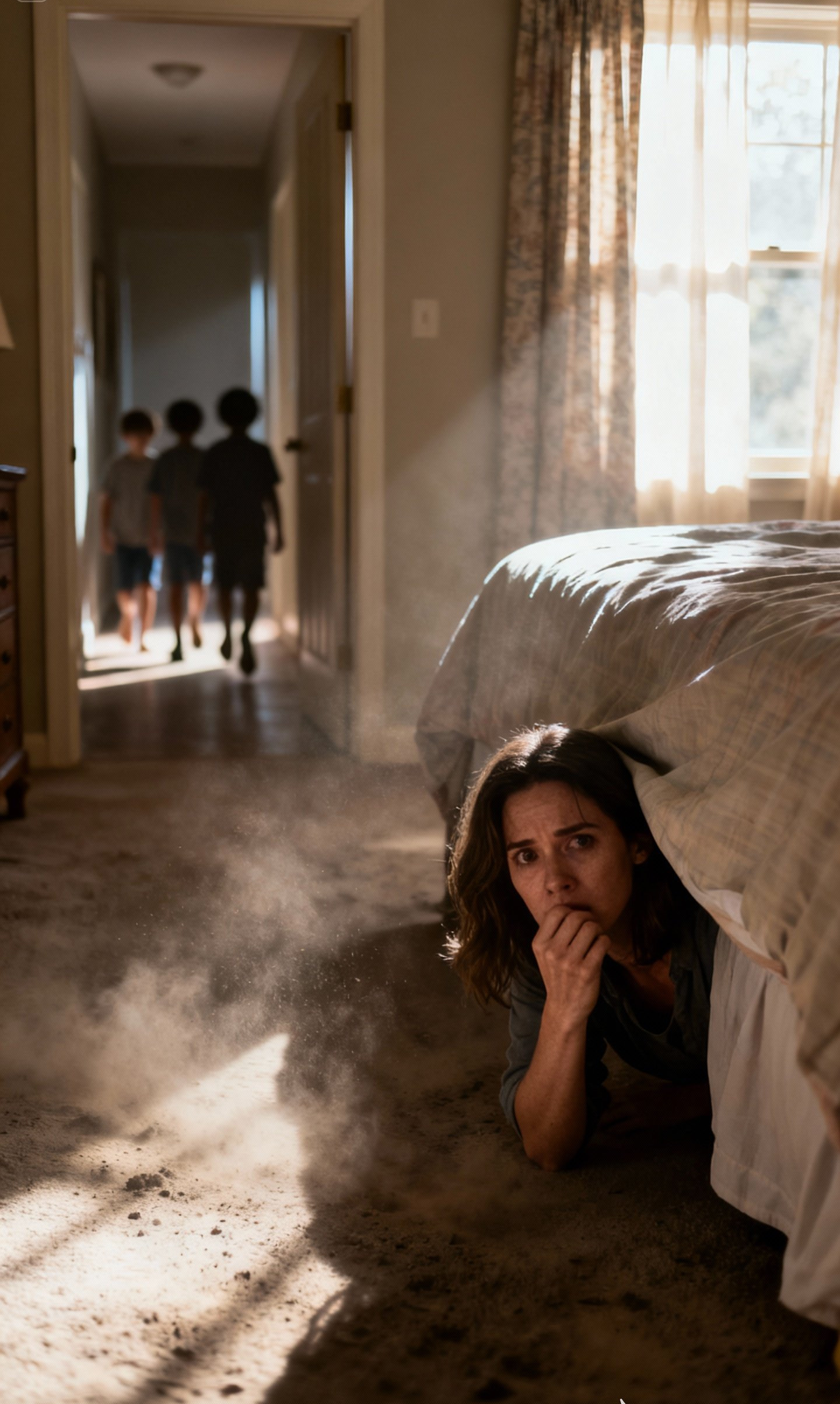 I stayed hidden as the footsteps moved down the hall. Children’s voices—three, maybe four. My heart slammed against the carpet.