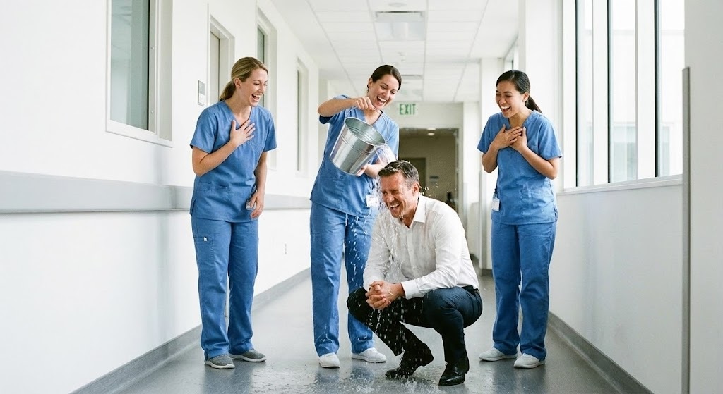The day unfolded. Doctors discussed schedules, nurses boasted about diplomas, and cleaners worked quietly. In the hallway, James, busy washing the floor, nearly collided with Vivien.