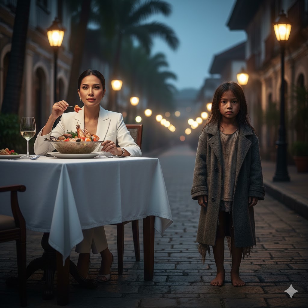 Maya hadn’t eaten a proper meal in three days. The last thing she’d found was half a pandesal in a trash bin—and even that she had shared with a skinny dog that followed her from Taft Avenue, as if it had chosen her. That night, the smell from the restaurant hit her like a memory of home. She pressed her palm against the cold glass, watching people tear bread slowly, seeing clean white napkins, steady hands, warm plates. No one was shaking.
