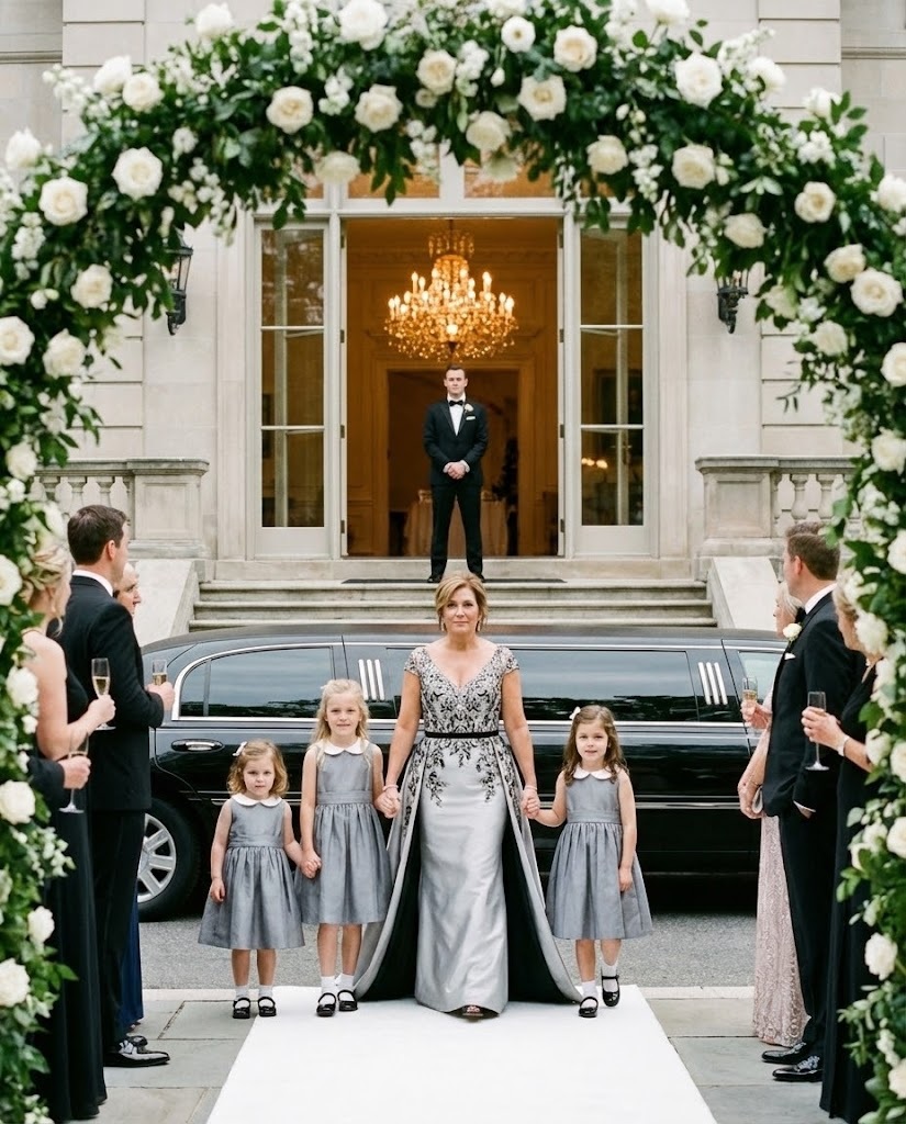 Then the moment came. A sleek black limousine rolled to a stop at the entrance. The door opened, and Emma stepped out in a gown of her own design, elegant and flawless, her hair styled, her presence commanding. The crowd gasped. She wasn’t alone. Three identical girls, radiant in matching dresses, followed her out, holding her hands.
