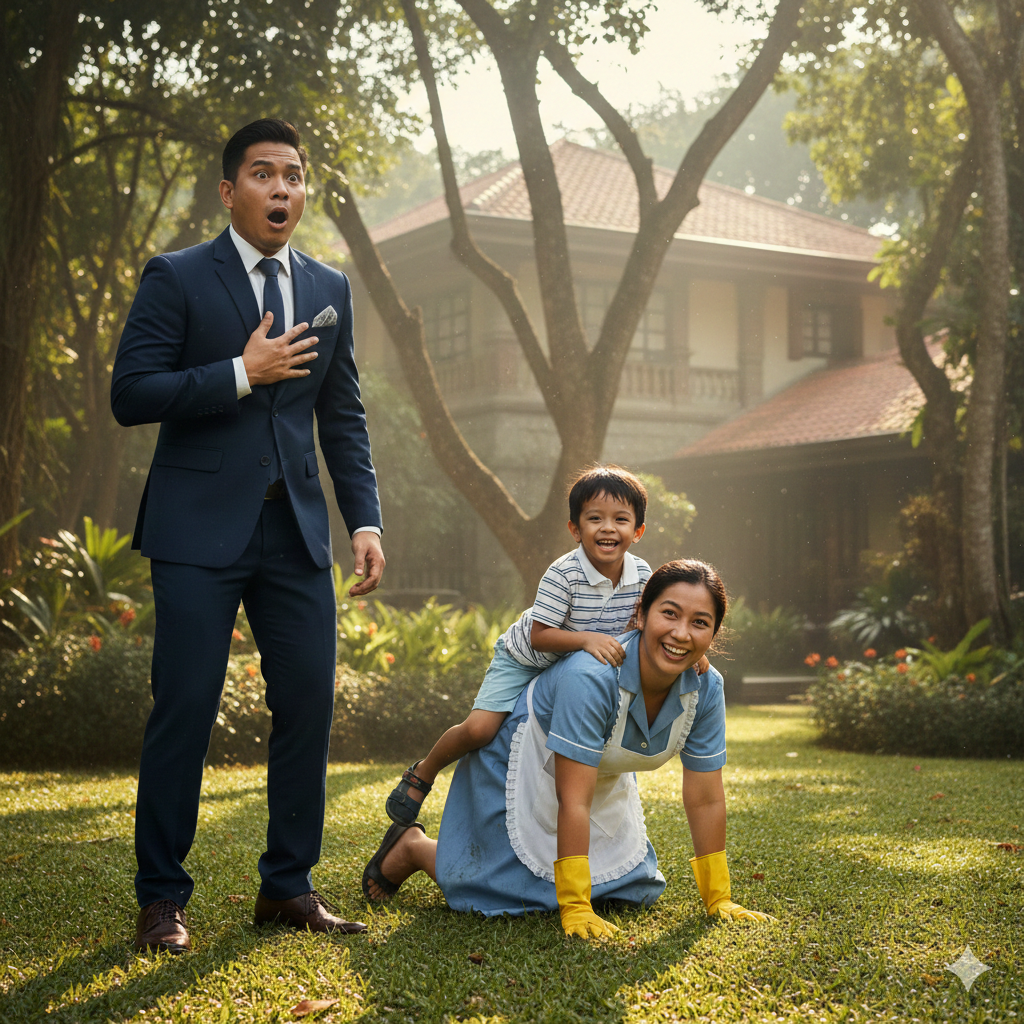 He had come from Manila in a flawless suit, mind full of numbers, carrying a leather briefcase that smelled of airports, meetings, and exhaustion. He had decided to arrive early without notice, guided by instinct, just for the chance to see his son before the day slipped away in endless calls. But the first thing he saw crossing the garden was so impossible that it almost broke his world.