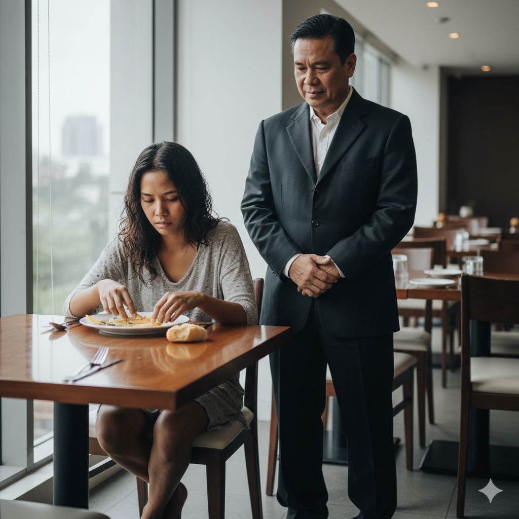 “I’m sorry, sir…” I whispered, trying to hide my worn-out shoes under the chair. “I was just very hungry. Please don’t report me.”