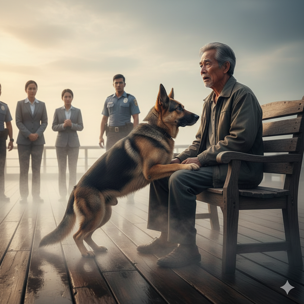 The German Shepherd perked its ears. It did not growl. It did not flee. It pressed closer to the old man’s leg, as if the world had turned dangerous again, and it knew exactly where to place itself.