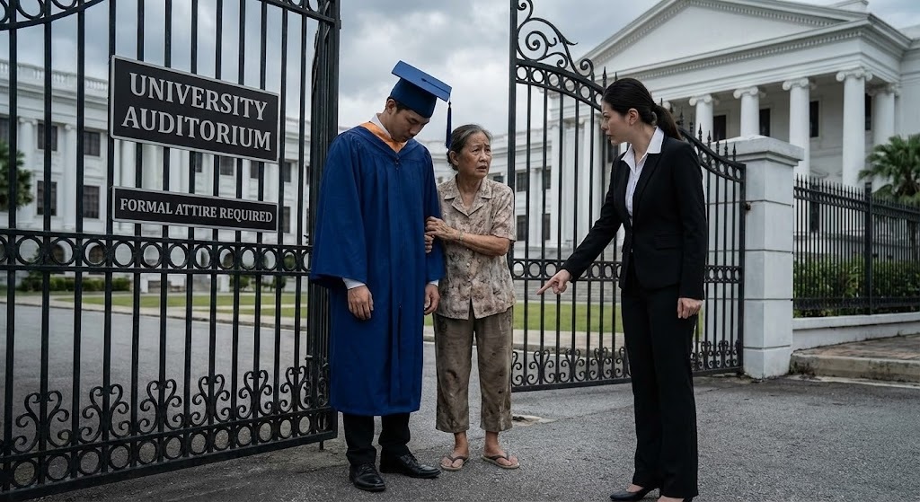 His parents remained outside—peering through the iron gate like strangers to their own child’s success.