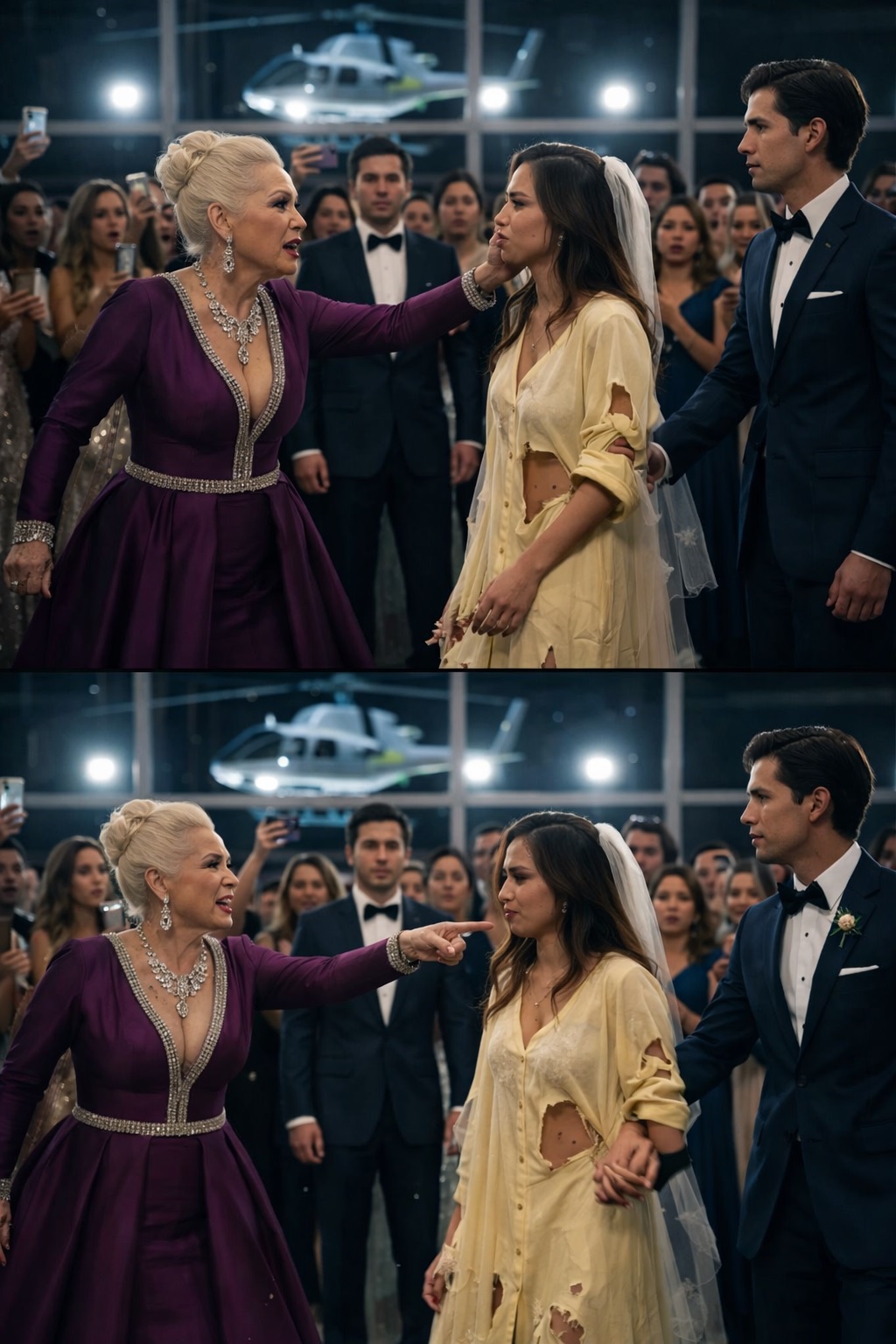 Brandon’s mother stood near the center of the room like she’d been installed there. She wore a deep purple gown, and her neck and wrists were covered in diamonds that looked like they were trying to outshine the chandelier.