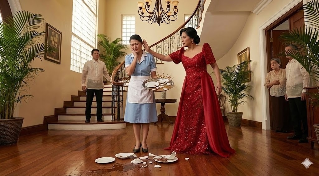 Maria Isabella Cruz, the new wife of the Filipino tycoon, stood in a shiny royal blue dress that caught the sunlight streaming through the tall windows. Her eyes blazed with fury, and her hand was still pressed against the cheek of a young maid in a crisp blue-and-white uniform. The maid — Ana Reyes — flinched but did not step back.