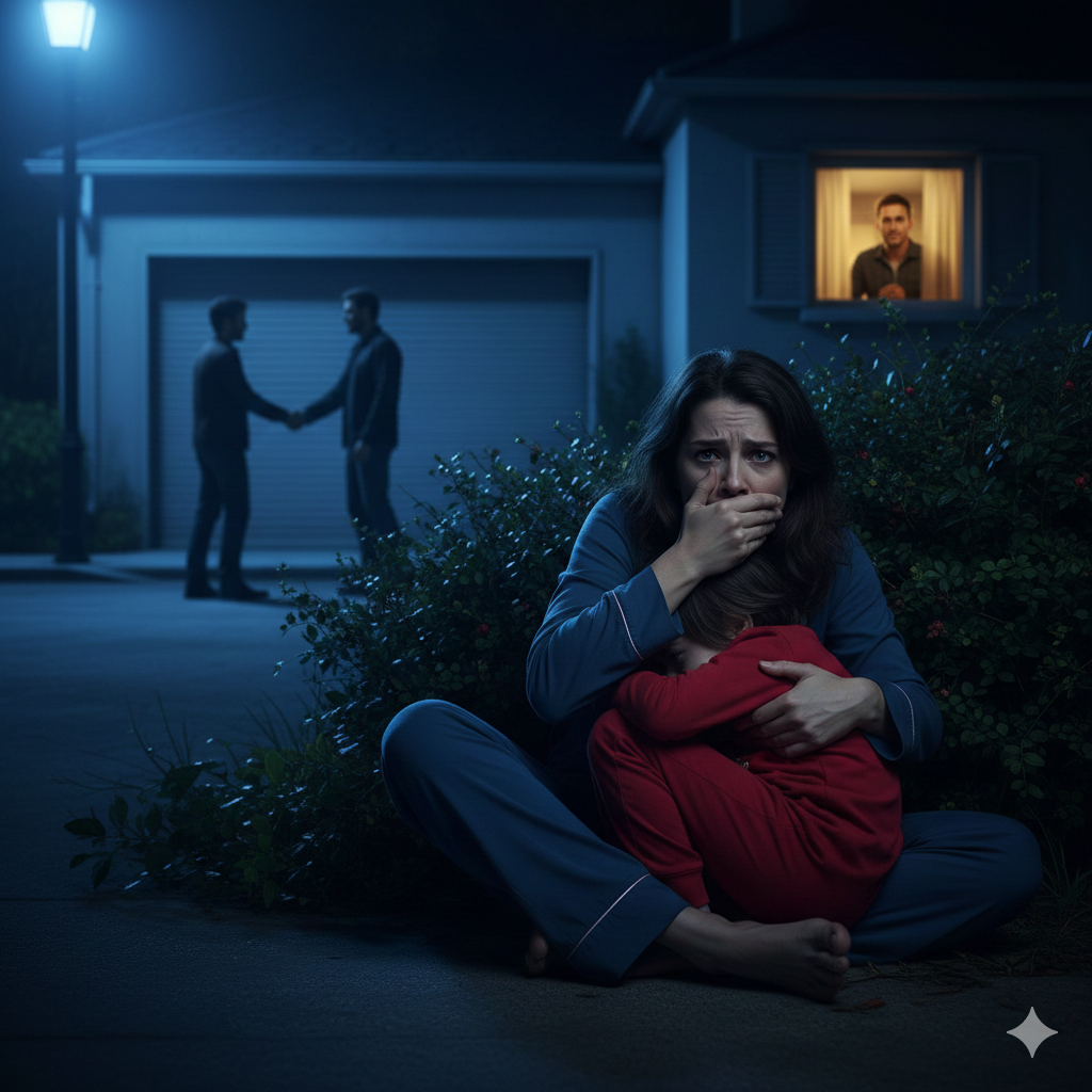 I froze among the wet leaves, my heart pounding in my chest as if it wanted to escape before I did. My hands were shaking so much that I could barely hold Emma, who was breathing fast, confused, not understanding why her father was inside the house with strange men while we hid like frightened animals. Liam, his eyes wide open, whispered, “Mom… Dad’s playing?” I didn’t know what to answer. There were no words that could protect him from what I was seeing.