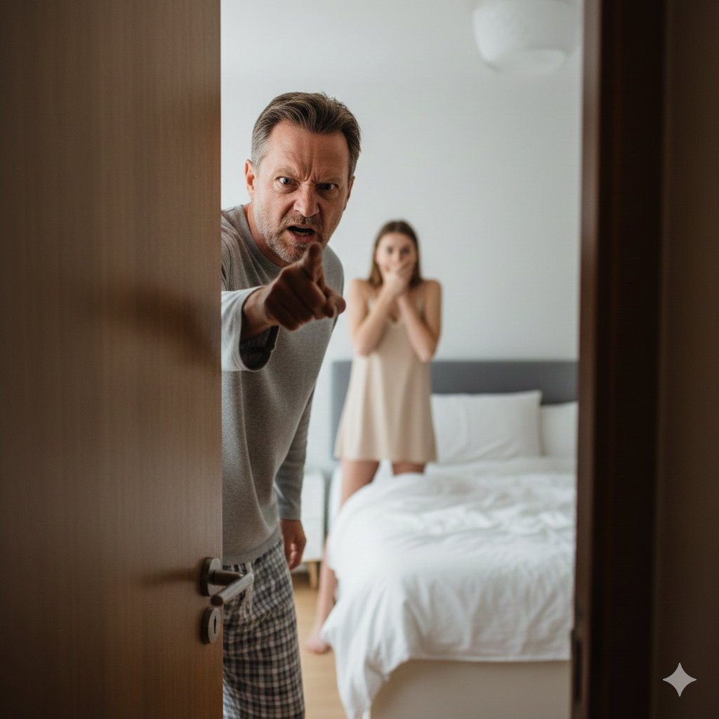 My hands were shaking as I reached for the door. The click of the lock sounded louder than thunder in my ears. The room was dim, lit only by a small bedside lamp. I stood frozen, unable to lift my eyes.