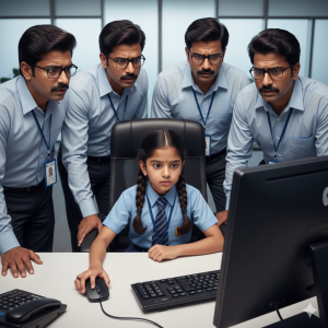 [Chapter 3: नन्ही उंगलियों का कमाल] मैनेजर ने मना करना चाहा, लेकिन विक्रम ने कहा, “सर, हमारे पास खोने को कुछ नहीं है। इसे आजमाने दीजिए।” काव्या बड़ी सी कुर्सी पर बैठी। उसके पैर ज़मीन तक नहीं पहुँच रहे थे, लेकिन उसके हाथ कीबोर्ड पर बिजली की तरह चलने लगे। खट-खट-खट… कीबोर्ड की आवाज़ गूंजने लगी। काव्या ने तेजी से कोड टाइप किए। उसने हैकर के जाल को काटना शुरू किया। स्क्रीन पर लाल रंग के वार्निंग सिग्नल आने लगे। “वो डेटा डिलीट कर रहे हैं!” विक्रम चिल्लाया। “बंद करो!” “नहीं!” काव्या ने जोर से कहा। “बस एक मिनट और… मैं उन्हें पकड़ने वाली हूँ।”