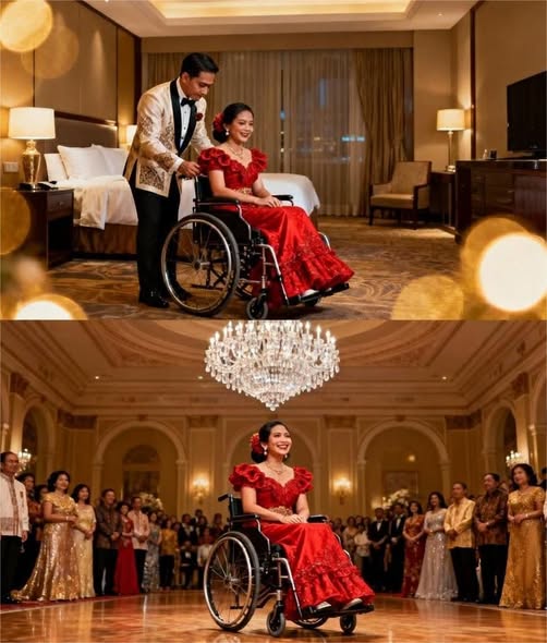 Naka-wheelchair siya—oo. Ngunit ang suot niya’y isang eleganteng pulang gown na tila apoy sa dilim. Simple ang disenyo, pero ang hiwa at tikas ay nagpapakita ng dignidad at lakas. Maayos ang buhok niya, minimal ang alahas, ngunit ang tindig ng kanyang mukha ay hindi kayang pantayan ng kahit sinong naglalakad sa red carpet.