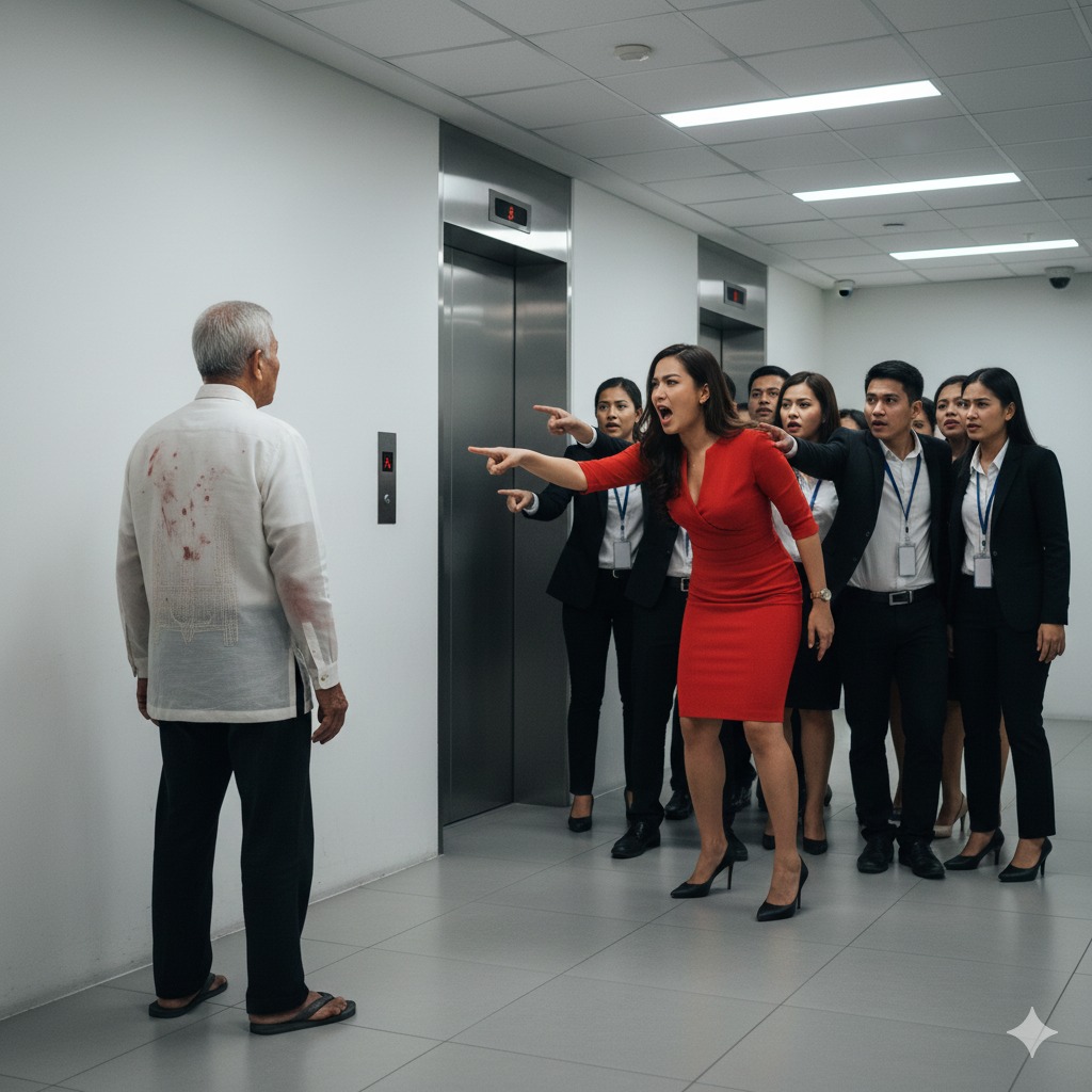 Narinig ito ng guwardiya at agad na tumakbo palapit. Tiningnan ng matanda ang luma niyang tsinelas na plastik, pagkatapos ay tiningnan ang malamig na tingin ng mga ito, at dahan-dahang lumabas sa elebador. Sumara ang pinto, tumingin ang babae sa salamin at inayos ang buhok, nasiyahan dahil “naresolba” niya ang nanggugulo.