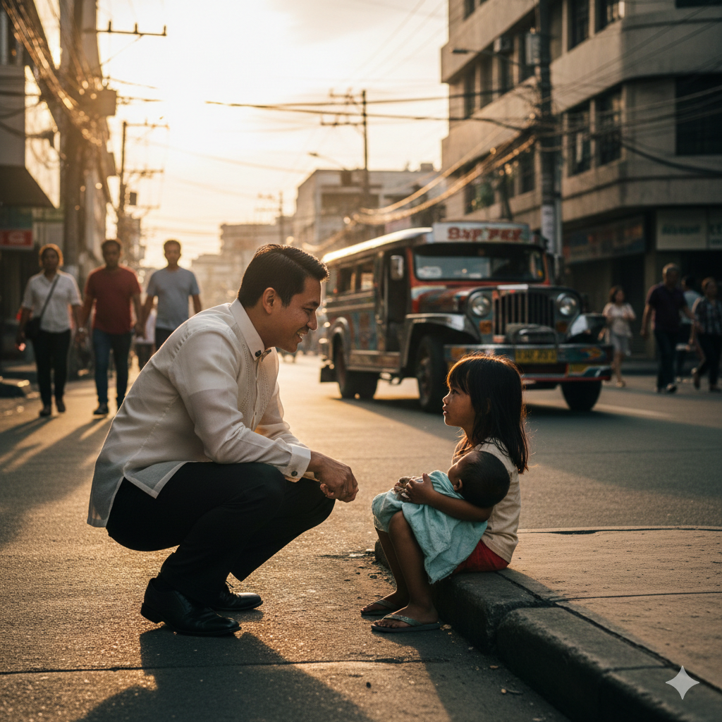 “Pakiusap po, sir,” bulong ng bata habang dumadaan ang isang lalaki sa mamahaling suit.