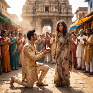 अजनबी ने जवाब का इंतज़ार किए बिना, पर्यटकों और विक्रेताओं के बीच वहीं घुटनों के बल बैठ गया। उसने एक छोटा सा लाल डिब्बा निकाला और उसे खोला। सूर्यास्त की आखिरी रोशनी में एक अंगूठी चमक रही थी, मानो किसी व्यंग्य का काम कर रही हो।