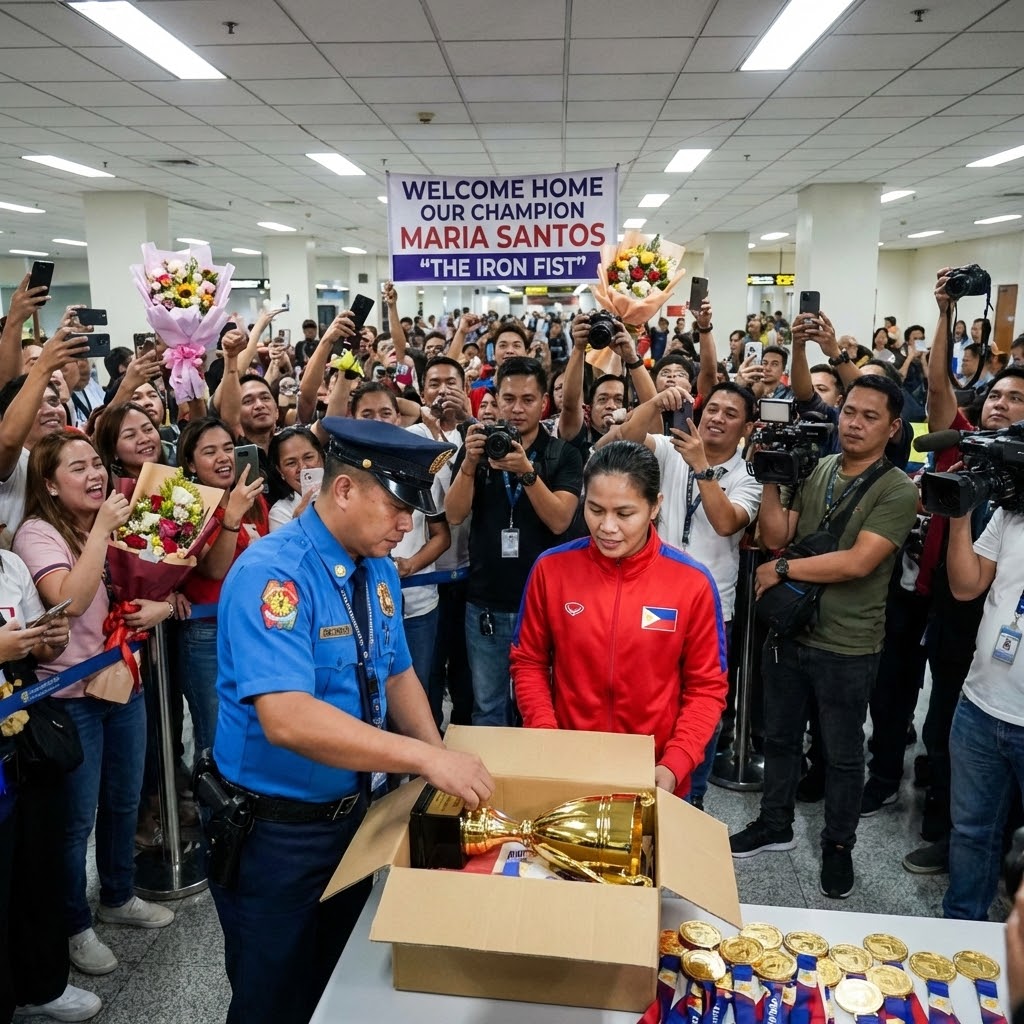 The airport’s glass doors suddenly swung open as a flood of media rushed in—GMA, ABS-CBN, TV5, and famous sports vloggers. Everyone was live-streaming!