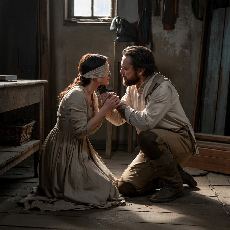 Los días se convirtieron en semanas. Yusha la acompañaba al río cada mañana, describiéndole el sol, los pájaros, los árboles, con tanta poesía que Zainab comenzó a sentir que podía verlos a través de sus palabras. Le cantaba mientras ella lavaba la ropa y le contaba historias de estrellas y tierras lejanas por la noche. Ella se río por primera vez en años. Su corazón comenzó a abrirse. Y en esa extraña y pequeña choza, algo inesperado sucedió: Zainab se enamoró.