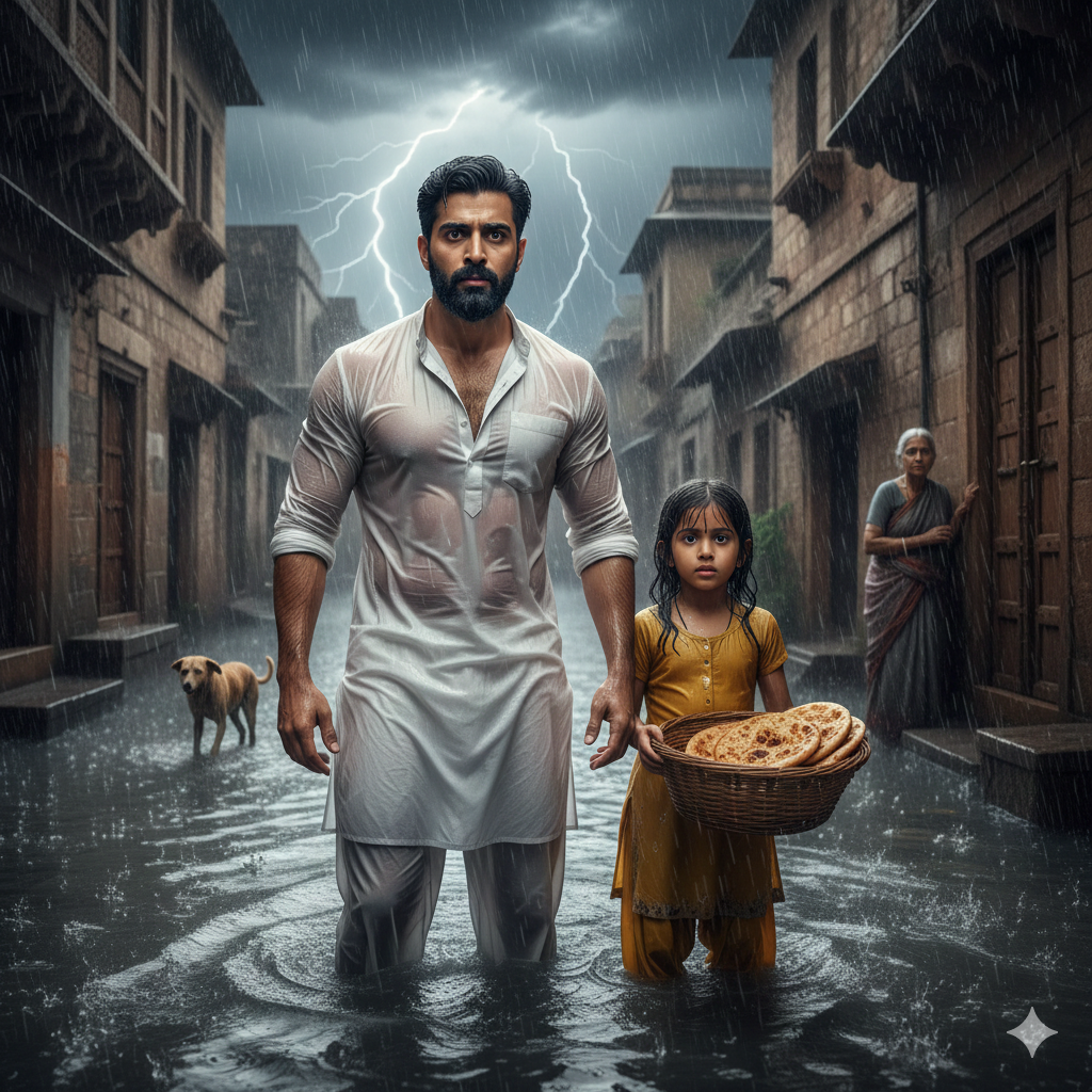 A young girl, barely fifteen, walked barefoot along the flooded sidewalk. Her feet were red from the cold asphalt, her thin kurta clinging to her frame. She bent forward protectively over a wicker basket, shielding it with a white cloth already soaked through.