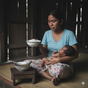 Inagaw ko ang bowl ng kanin sa kamay ng aking asawa. At sa sandaling tumingin ako sa loob, parang tumigil ang tibok ng puso ko. Nalamigan ako sa sobrang gulat. Hindi iyon bowl ng kanin para sa isang bagong panganak. Iyon ay maligamgam at matigas na bigas na panis, na hinaluan ng malabnaw at maulap na sabaw. Sa ibabaw ay may ilang piraso ng maputing taba ng baboy na amoy panis at nakakapangilo.