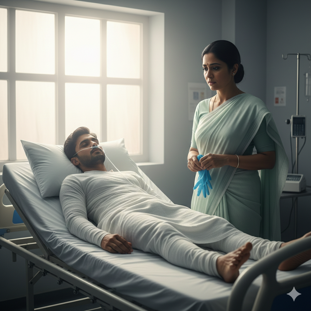 A year later, I was living like a shadow. During the day, I worked part-time at a clothing store in T. Nagar. At night, I went to the hospital to take care of him. From wiping his body, changing his clothes, to massaging his hands and feet—I did everything myself.
