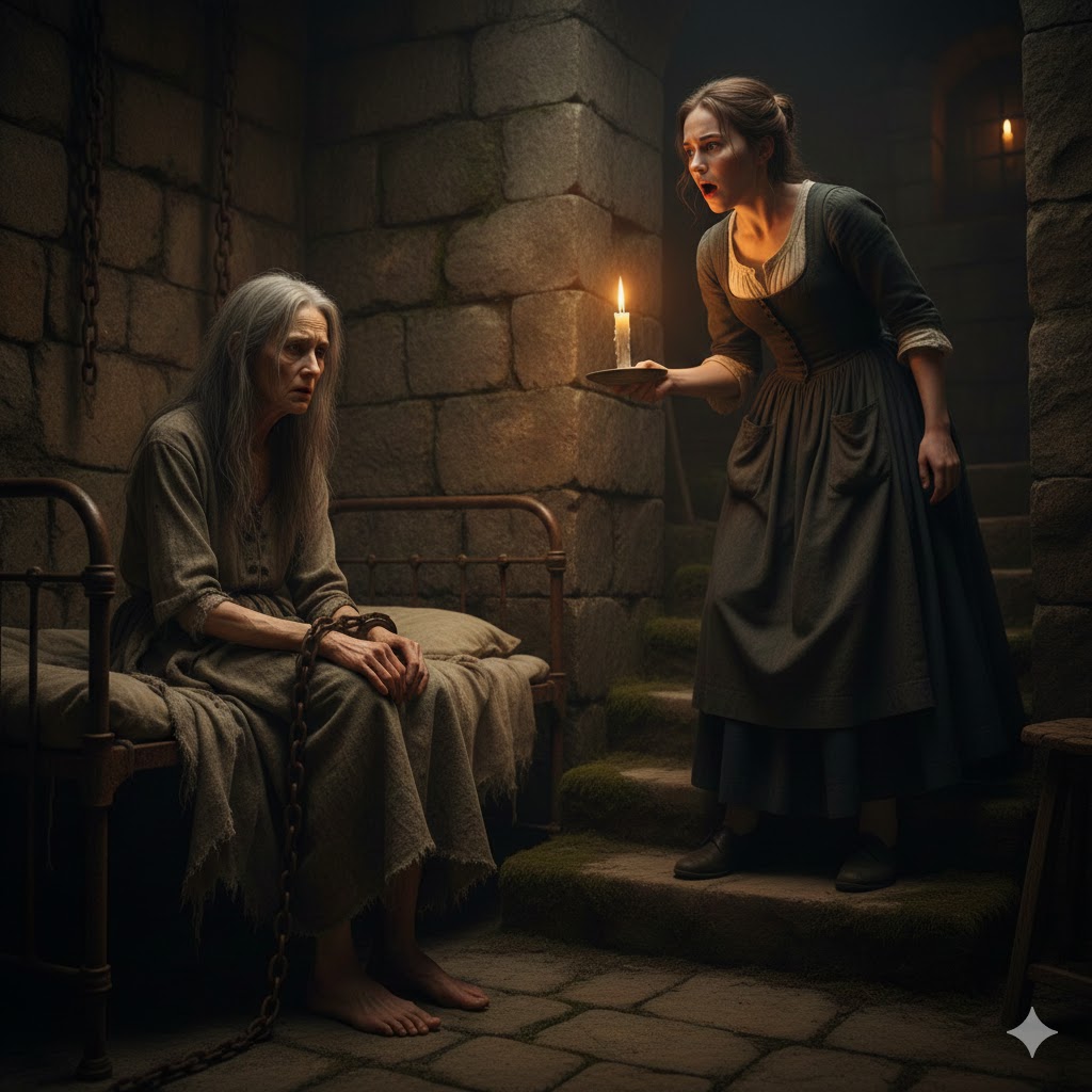 A groan answered. Then a whisper. Clara, it’s you. The young woman’s heart clenched. She shone the flashlight toward the corner and then she saw her. An elderly, thin woman with completely white hair sat on an old mattress. Her wrists were marked by years of confinement, and her face, though weary, retained a tenderness that touched her deeply. Clara fell to her knees, unable to hold back her tears. My God, what have they done to her? The woman looked up. Are you the new employee?