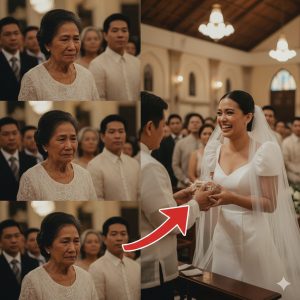 Ang mga bisita ay nagbulung-bulungan, nagulat sa biglang pagbabago ng sitwasyon. Si Marco, ang kanyang bagong asawa, ay lumapit at patong ang kamay sa balikat ng matandang babae. “Ma, buti po at nakarating,” bulong niya.