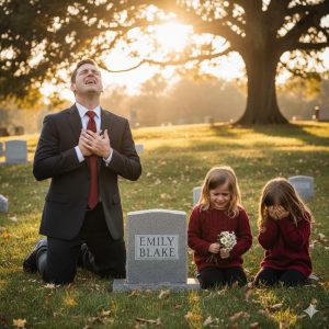 But it wasn’t the name on the grave that stopped him in his tracks. It was the two small figures kneeling beside it. He saw them from a distance at first, two little girls, maybe five years old, with matching brown hair pulled into low pigtails and wearing red sweaters that looked far too warm for the summer air.