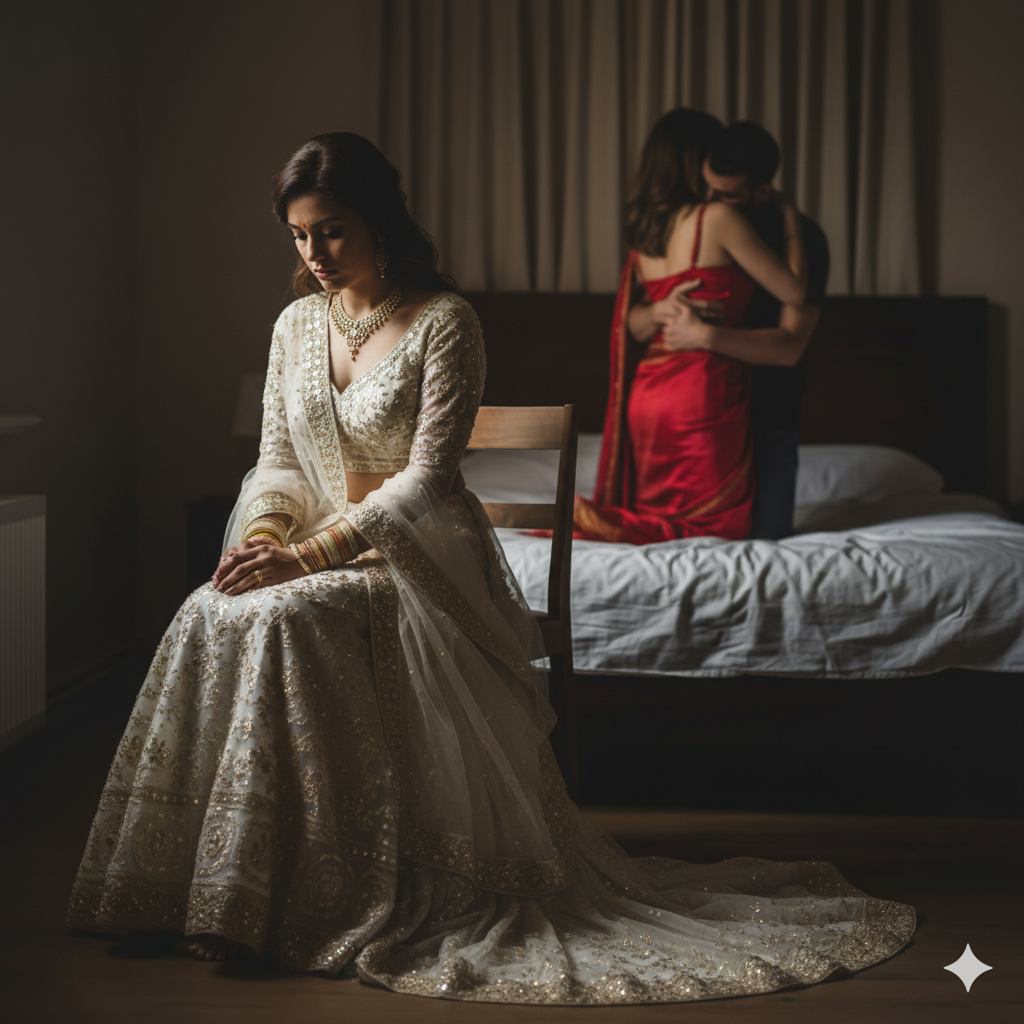 I sat at the edge of the bed, still wearing my wedding dress, waiting for him.