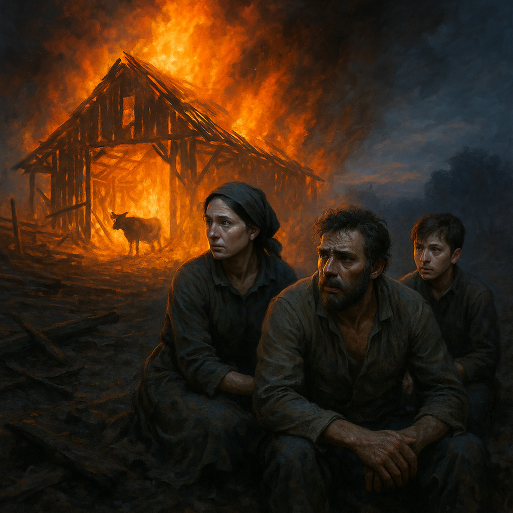 Cuando estuvieron a salvo, las fuerzas abandonaron a Grigori. Se dejó caer sobre la fría y húmeda tierra y observó cómo el fuego devoraba diez años de su vida. Diez años de trabajo, dolor y esperanza. Había llegado allí solo, sin dinero, con solo una fe ciega en sí mismo. Había trabajado hasta el agotamiento, con el sudor de su frente. Pero los últimos años habían sido una verdadera maldición: sequías, enfermedades del ganado, conflictos con el pueblo.