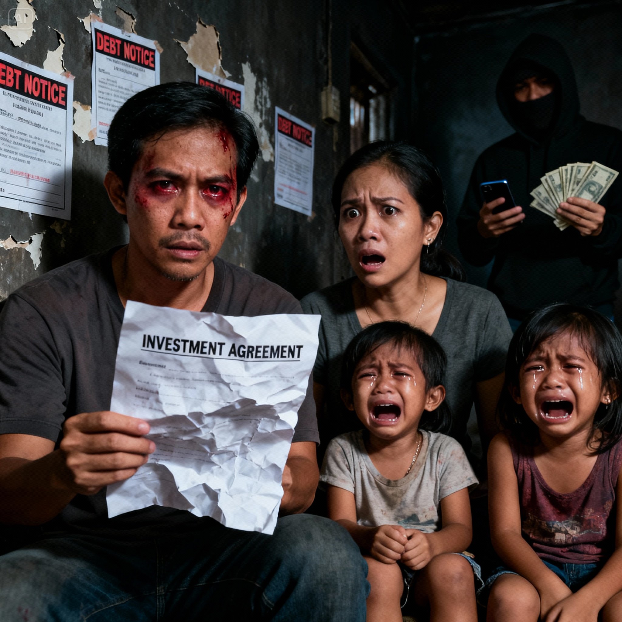 Sa isang maliit na bahay sa Pampanga, nagkakasya ang apat na miyembro ng pamilya Santos sa isang lumang mesa—si Nestor, si Maribel, at ang mga anak nilang sina Aira at Bunso Kiko. Sa dingding, nakadikit ang mga papel na ayaw nilang tingnan: DEBT NOTICES, listahan ng overdue, at mga sulat na parang araw-araw kumakatok sa dibdib.