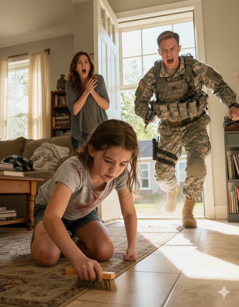 Ella’s head shot up. Her father, Sergeant Daniel Parker, stood in the doorway, his military uniform dusty from a week-long deployment. His eyes widened at the scene before him — the blood, the exhaustion, the tiny figure collapsed on the kitchen floor.