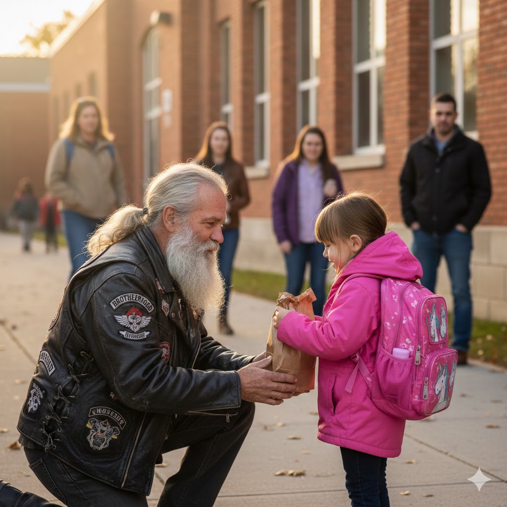 Mrs. Davidson folded her hands on her desk. “Mrs. Torres, for the past three weeks, your daughter has been giving her lunch to a man who waits outside our school every morning. A man on a motorcycle. A man who, frankly, looks extremely dangerous.”