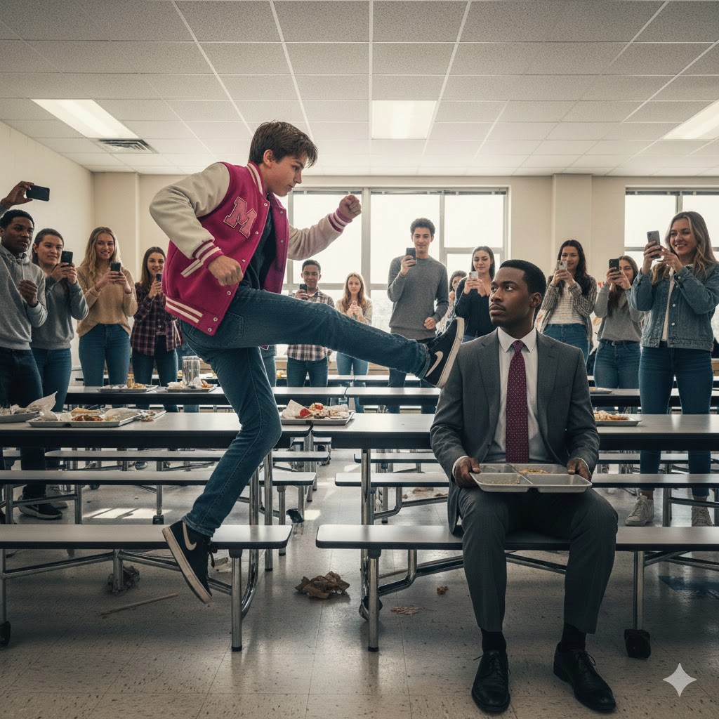 A sharp kick at the side of Mr. Daniel’s leg while he was quietly eating his lunch and his body jerked, sending half the food on the tray, sliding across the table. The cafeteria went silent for a fraction of second. Then a murmur rippled through the crowd. The boy who had done it, Liam, smirked like he owned the place, leaning back with that familiar arrogance that made people step aside without thinking.