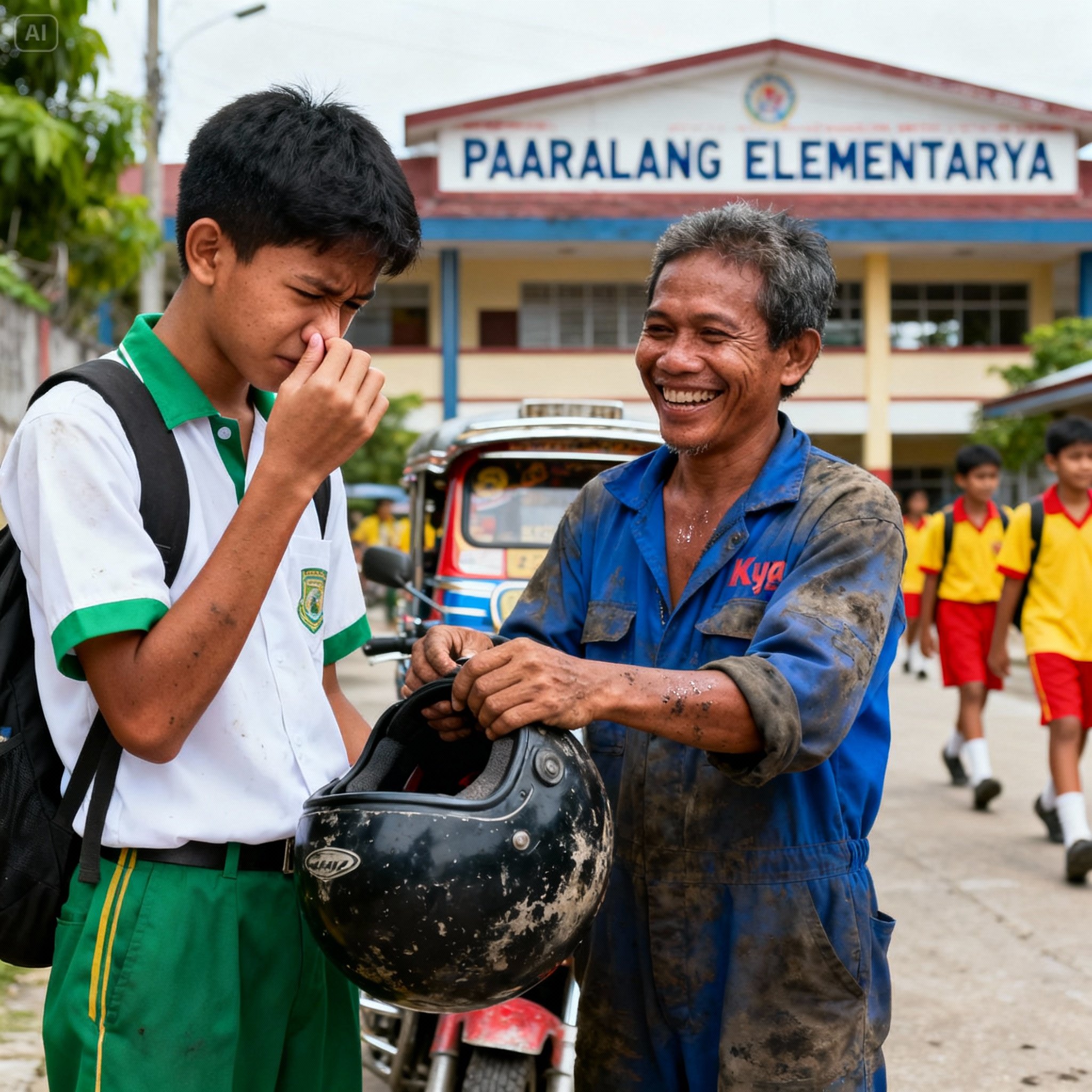 Natahimik kami pareho. Tumingin siya sa akin, humalukipkip ng ngiti, parang tinakpan ang hiya gamit ang biro. “Oo nga, eh,” sabi niya. “Baka pati ’tong helmet, may lasa nang gasolina.” Tawa siya nang mahina, pero ramdam kong hindi iyon totoo. Nakita ko rin kung paano tumingin ang iba kong kaklase: may umirap, may nagtawa, may nagtakip ng ilong. Pumasok ako sa loob, iniwan si Kuya sa labas na parang poster na hindi ko gustong makita ng iba.