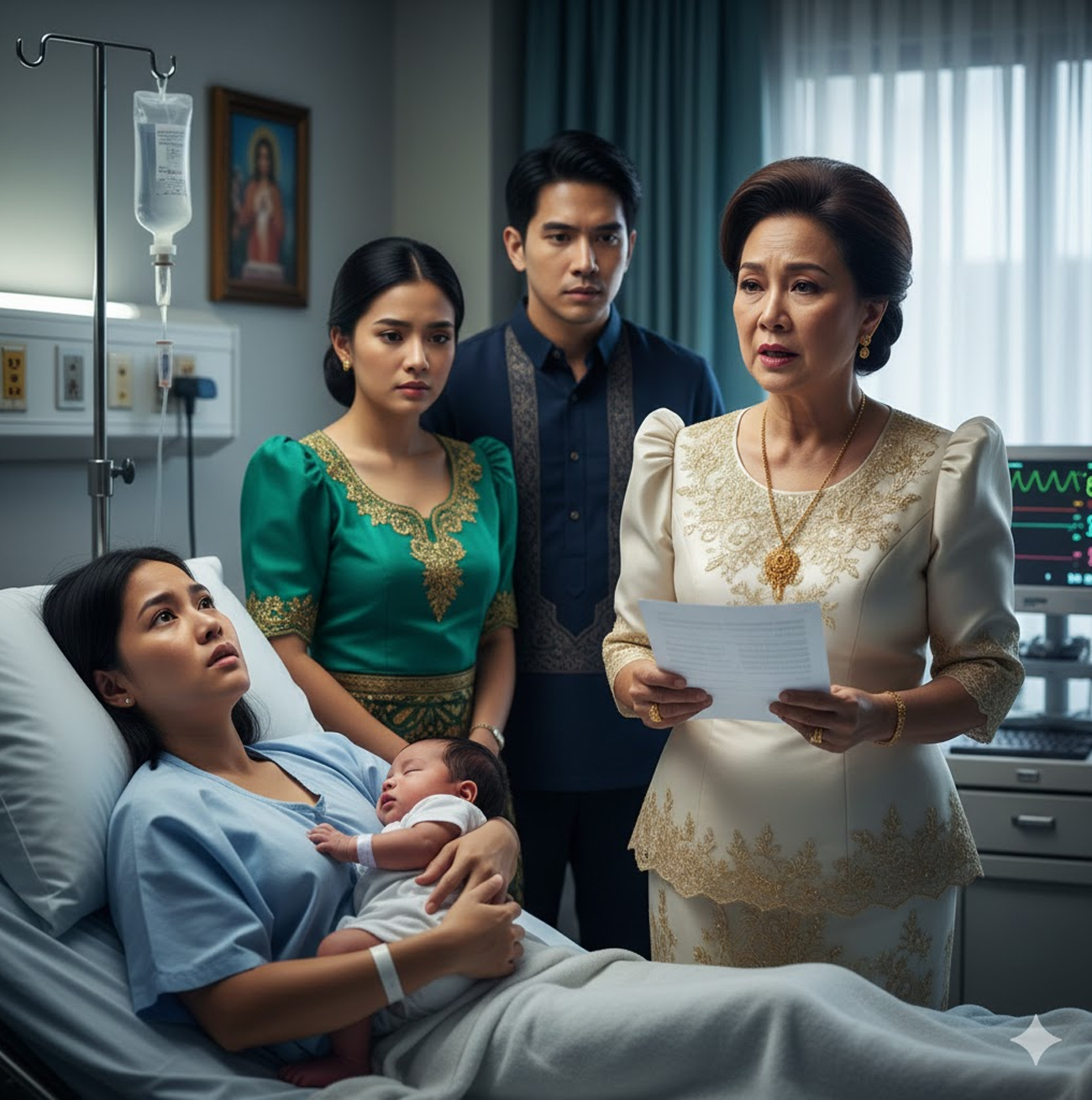 The woman sat on the hospital bed, holding her newborn son against her chest, his tiny heart thumping rapidly beneath the soft blanket.