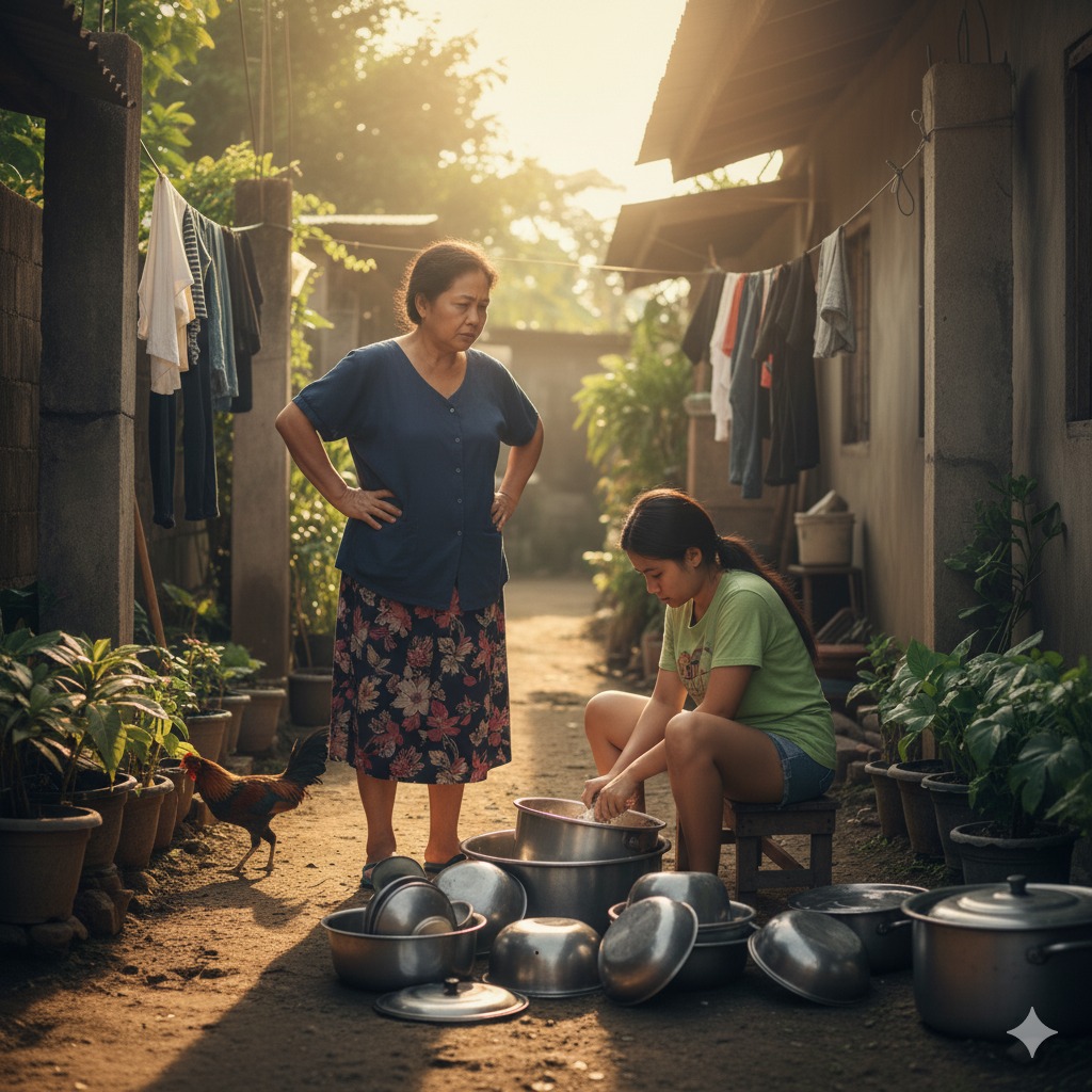 The first day I became a daughter-in-law, my mother-in-law brought out all the dishes, pots and pans and told me to wash them, then said: if I don’t do it, “I’ll take them back to my parents’ house” and then… I had just arrived at my husband’s house in a neighborhood in Quezon City. The previous night, I was still getting used to the strange land, when the next morning, Mama-in-law called me to the kitchen. I just thought she would make tea or cook breakfast. Unexpectedly, she brought out the entire cupboard of dishes, old pots and pans from the corner of the kitchen, things that had not been used for a long time and placed them in the middle of the yard.