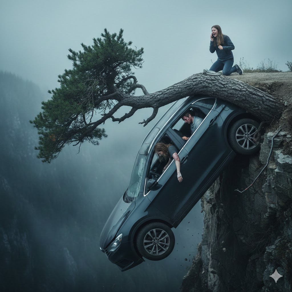 My daughter had cut the brake lines. When the car slid off the cliff, we survived only because it got caught on a lone tree. I was about to scream for help, but my husband whispered weakly, “Pretend to be dead. Don’t make a sound.” Outside, we heard our daughter calling emergency services, sobbing hysterically and begging them to come save us. My husband’s voice broke as he gripped my hand. “I’m sorry… this is all my fault.”