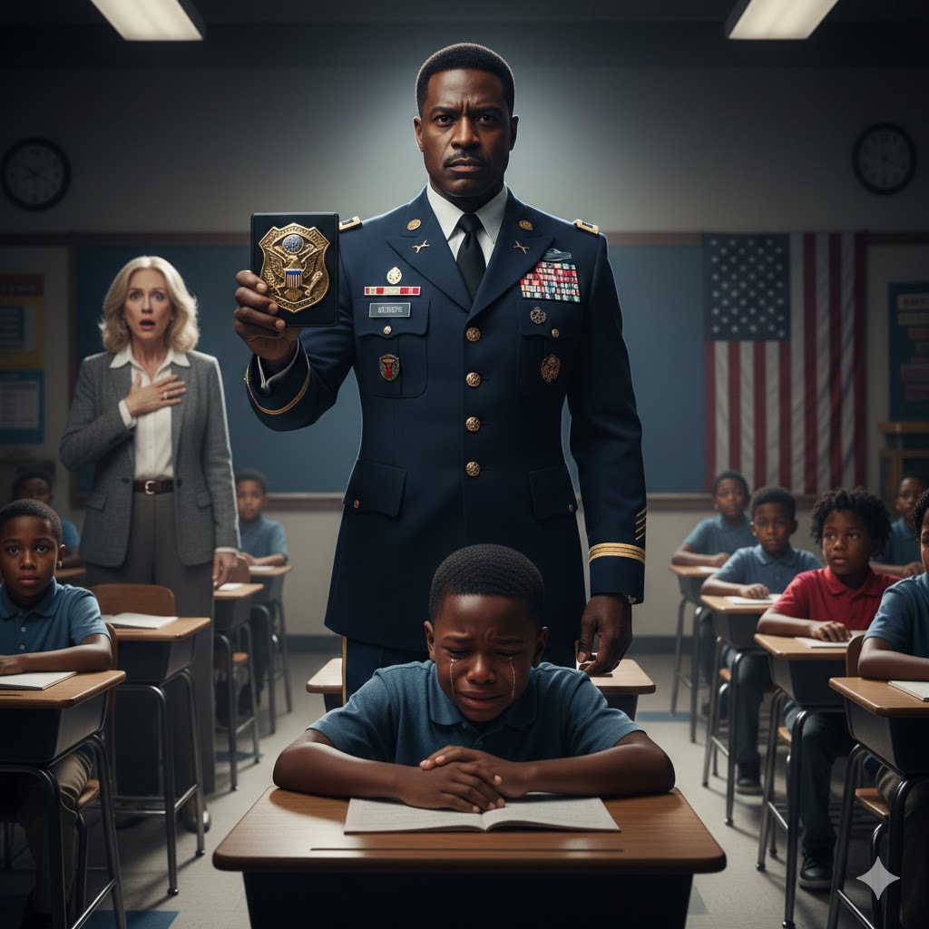 “My dad works at the Pentagon,” the Black boy whispered. Laughter burst out immediately. The teacher folded her arms and sneered, “You really think we believe that kind of bragging?” The boy stayed silent, eyes glistening. Ten minutes later, heavy military boots echoed down the hallway. A high-ranking officer stepped into the classroom, his military ID gleaming in his hand. He looked around and said sternly, “Who called my son a liar?”