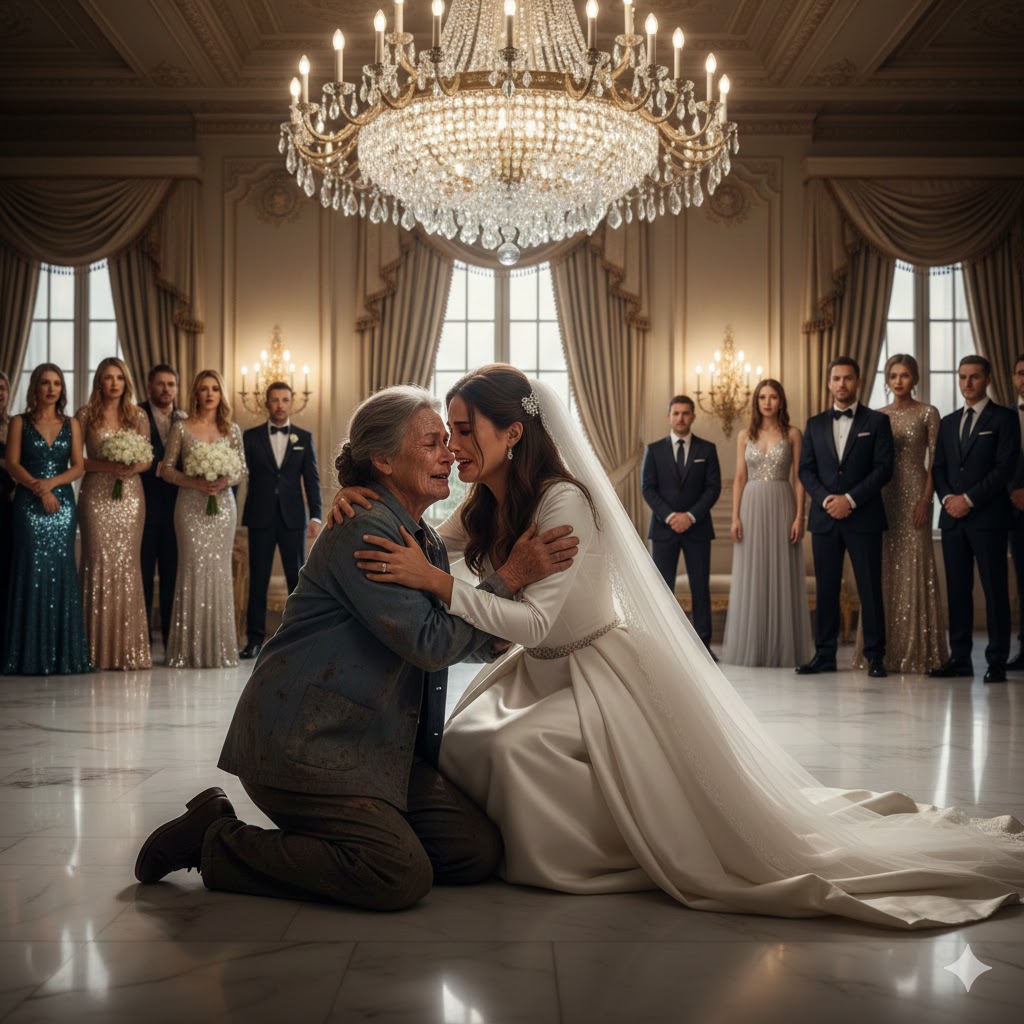 In the middle of the lavish wedding, an elderly beggar quietly walked in, only hoping for a glass of water. Guests murmured in annoyance, and security moved to drag her out—but the bride froze the moment she saw the woman’s face. She rushed forward, dropping to her knees before her, shocking the entire hall. Her voice trembled: “Mom… I’m sorry. I never imagined you were still alive… or still searching for me.” The room turned to ice…