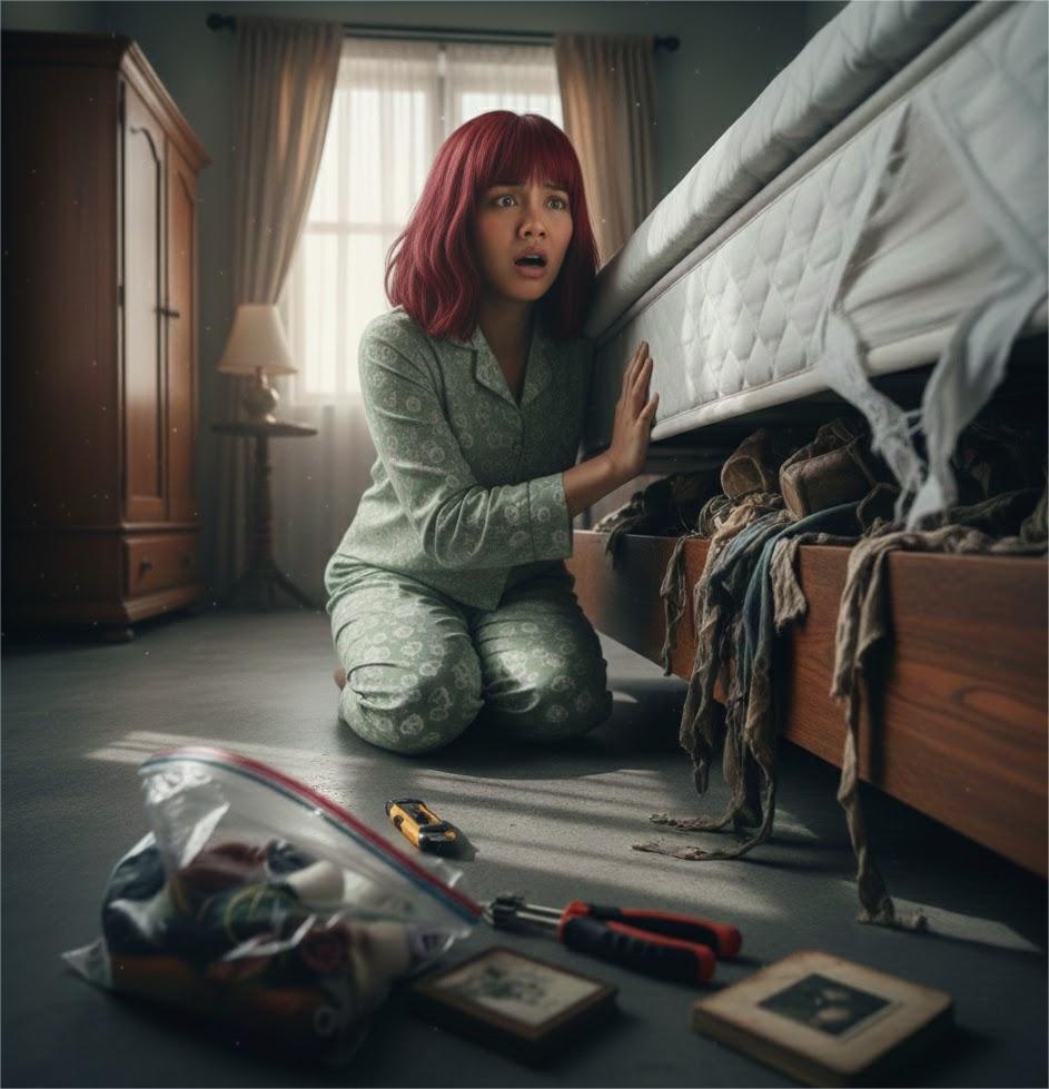 Inside the mattress, in the middle of the carved-out foam, was a large, dark wooden box, deeply embedded and stuffed with rotten rubber pieces. The box had no lock. I opened the lid… and at that very moment, my legs went weak, and I sank to my knees on the floor.