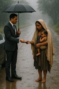 However, something was about to disrupt this relentless rhythm. As he stopped at a red light, Alexander saw a face that stood out against the cityscape. At the corner of the sidewalk, a young woman held a child close to her, trying to shield it from the pouring rain with her own body. She was wearing an old, wet cloak, her thin arms shaking the child with desperate tenderness, barely enough to protect him from the cold. Alexander looked at her in his rearview mirror, and he felt an unfamiliar feeling awaken in him.
