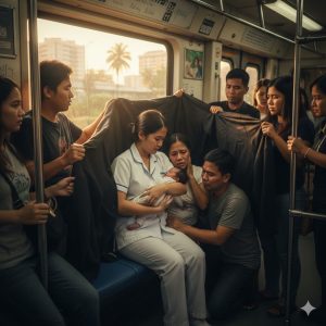 Natigilan ang lahat. Nagkagulo sa gitnang bahagi ng bagon. Isang buntis na babae, si Aling Sarah, ang biglang napaluhod sa sahig habang hawak ang kanyang tiyan. Namumutla siya at tagaktak ang pawis. Kasama niya ang kanyang asawa na si Mang Berting, na taranta at hindi alam ang gagawin.