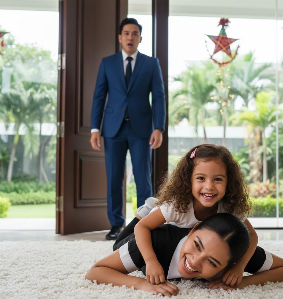 Felicia stayed kneeling, watching this silent child. Then she heard footsteps in the hall, heavy, fast. The door swung open. A man stood there, tall, dark suit, Bluetooth in his ear. He looked at Felicia like she was furniture.
