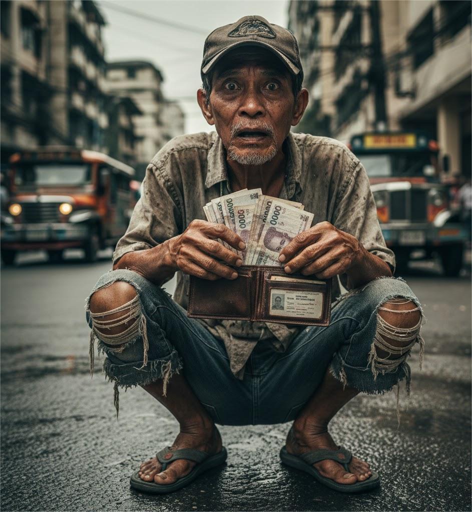 He sat back down on the side of the road, holding the expensive wallet. He opened it — it contained ₱25,000, several credit cards, and an ID with the name “Marco Villanueva.”