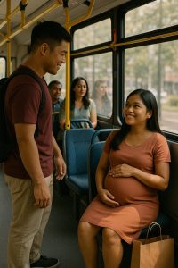 At the next stop, a pregnant woman boarded the train. She was wearing a blue maternity dress, sweat beads in her hair, one hand under her belly, the other gripping the rail as the bus spun. The carriage fell into the familiar silence of urban embarrassment: everyone was tired, everyone was busy, everyone was justified. Ethan bit his lip. His future hung in the balance from today’s interview—but there was also a small life hanging in the hollow of his belly.